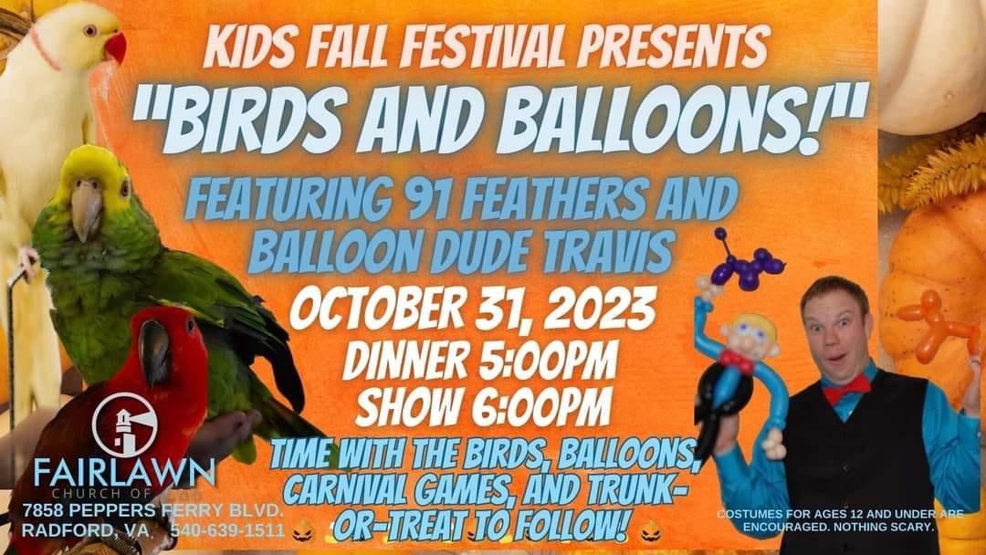 Don't miss our Kid's Fall Festival! This year will feature Birds (91 Feathers) and Balloons (Balloon Dude Travis). Dinner starts at 5:00 PM and the show starts at 6:00 PM with carnival games, stations, prizes, and a Trunk-or-Treat to follow.