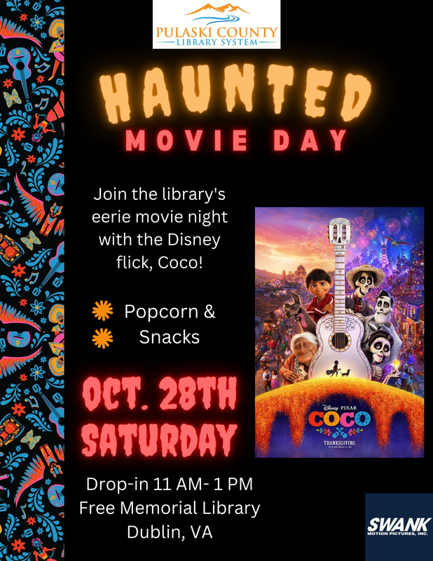 The Dublin Library (Charles & Ona B Free Memorial Library) presents Haunted Movie Day with Coco on Saturday, October 28, 2023.