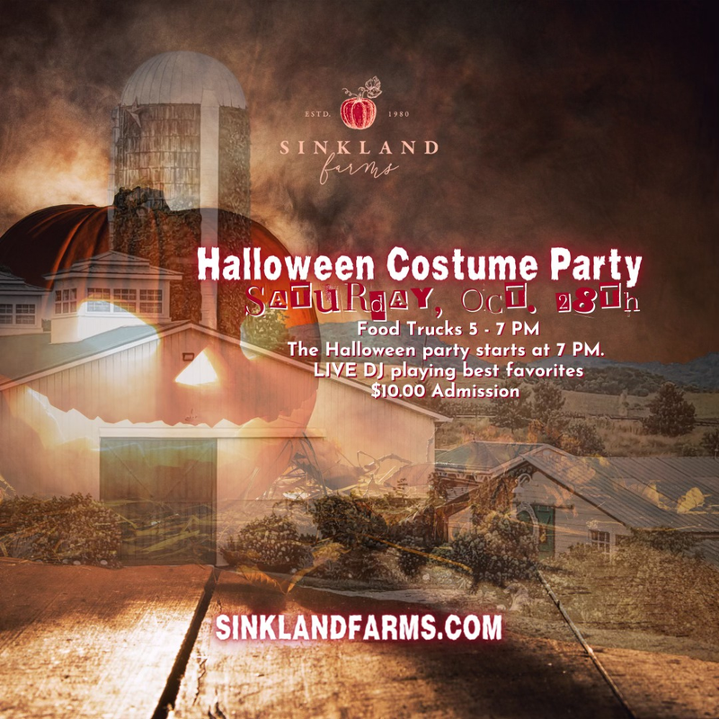 Dress-up, dance and party! Sinkland Farms will host a Halloween Party and a Costume Contest with cash prizes and a live DJ playing your favorite tunes! The costume contest will be judged around 8:30 PM.