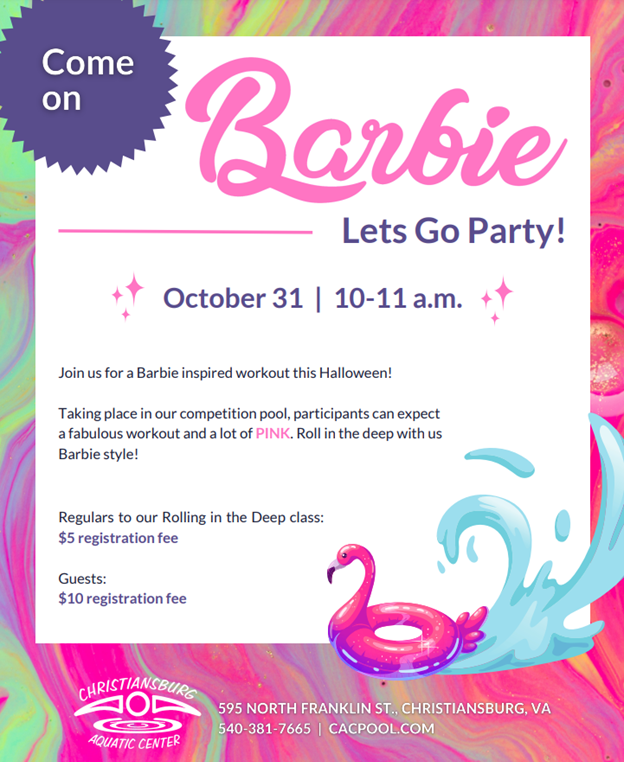 The Christiansburg Aquatic Center presents the Aqua Barbie: Halloween Workout on Tuesday, October 31, 2023.