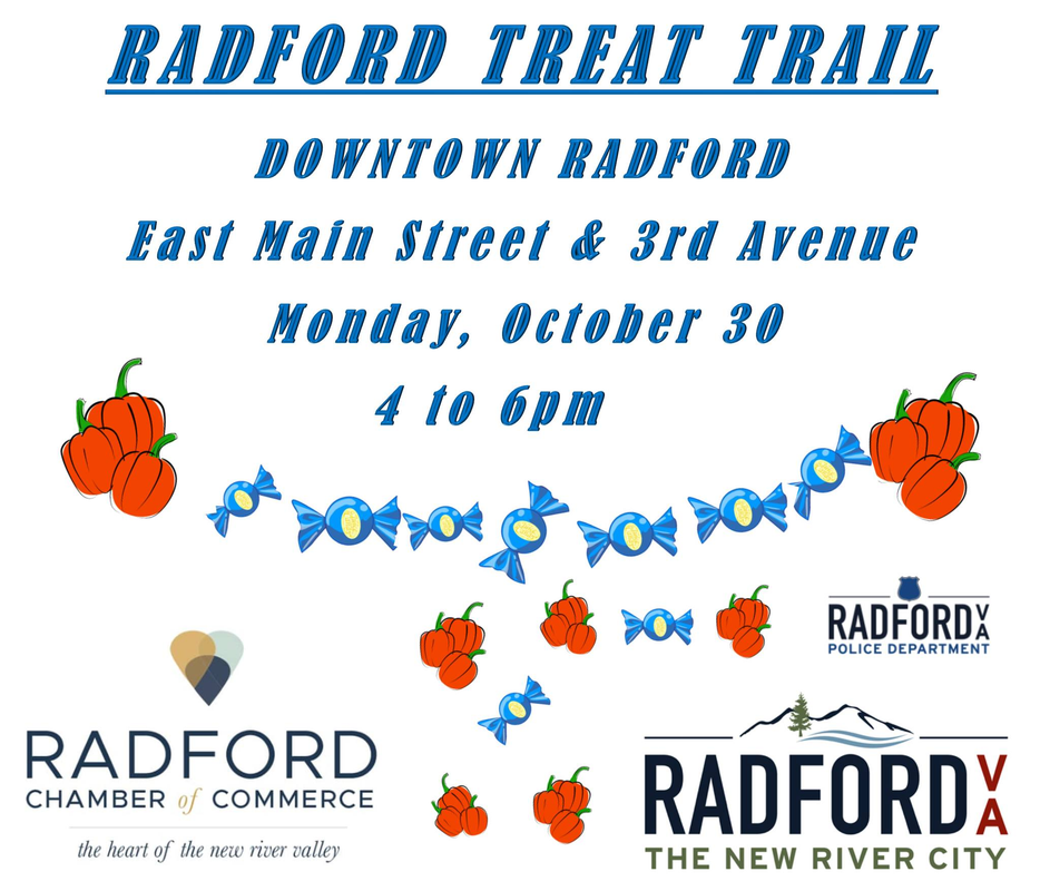 The Radford Chamber of Commerce, the City of Radford, VA and Radford Police Department presents the 2023 Radford Treat Trail on Monday, October 30, 2023.