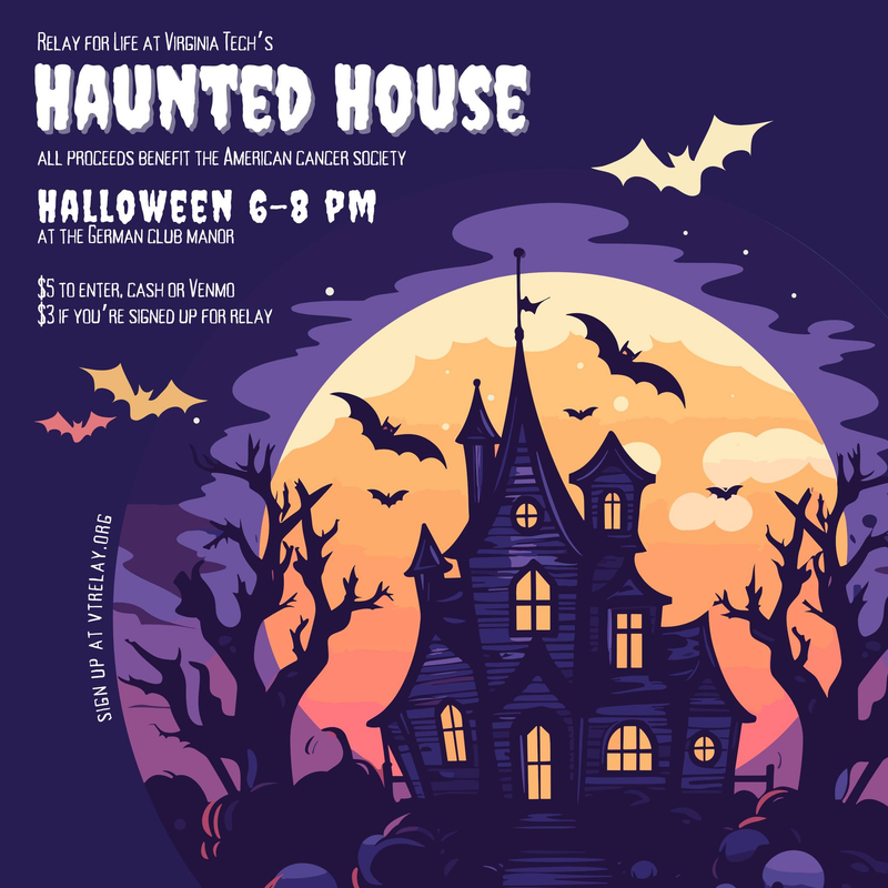 Virginia Tech Relay For Life presents their 2023 Haunted House on Tuesday, October 31, 2023 at the German Club Manor on the Virginia Tech campus.