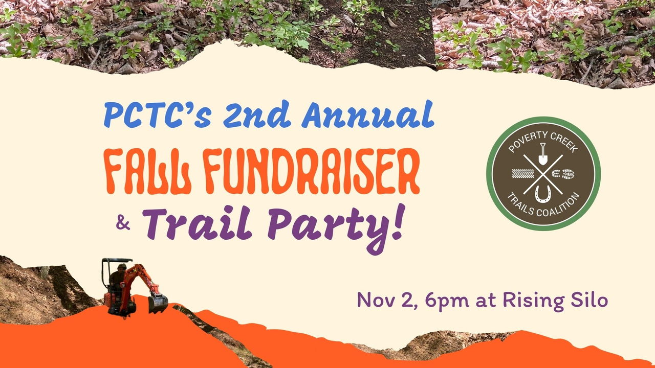 The Poverty Creek Trails Coalition presents their 2nd Annual Fall Fundraiser and Trail Party on Thursday, November 2, 2023 at Rising Silo Farm Brewery.