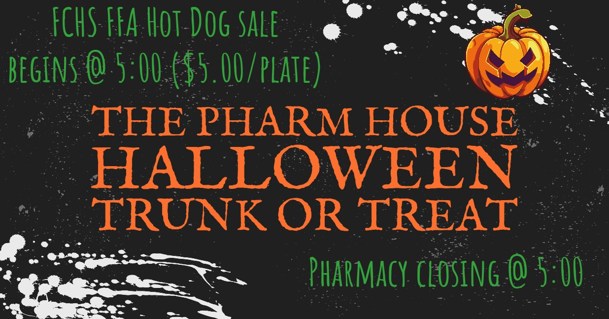 The Pharm House presents their 2023 Trunk or Treat with Hot Dog Sale on Tuesday, October 31, 2023.