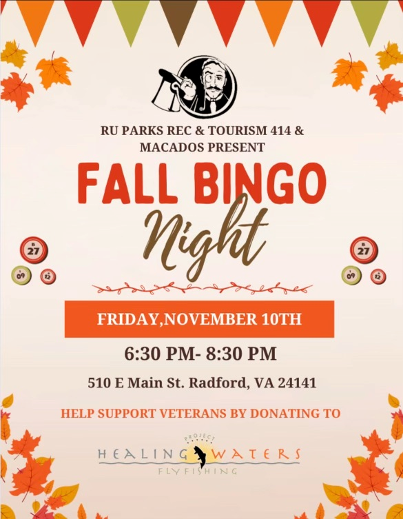 Radford University Recreation, Parks, and Tourism 414 Class presents a Fall Bingo Night on Friday, November 10, 2023 at Macado's Radford, Virginia.