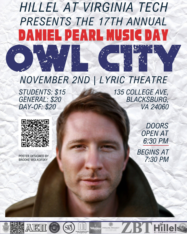 Hillel at Virginia Tech presents the 17th Annual Daniel Pearl Music Day concert featuring Owl City on Thursday, November 2, 2023.