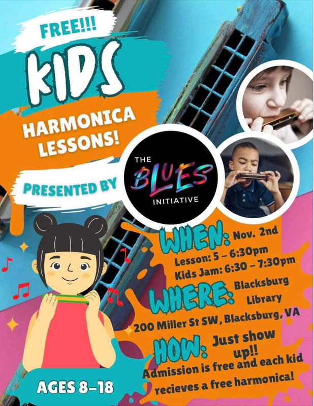 Blacksburg Library and The Blues Initiative presents Free Kids Harmonica Lessons with The Blues Initiative on Thursday, November 2, 2023.