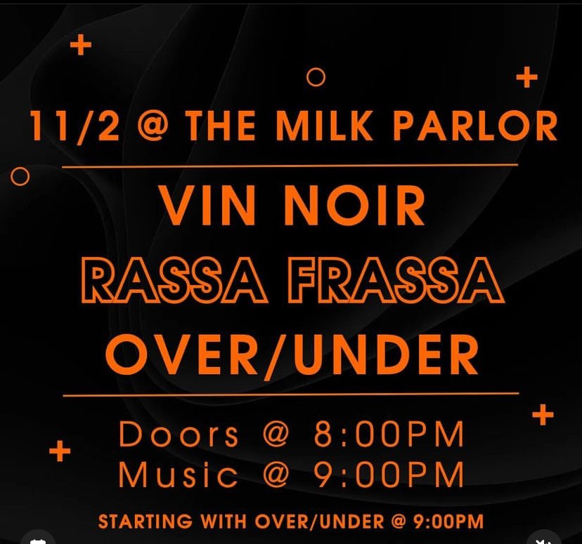 The Milk Parlor presents a Three Band Concert with Vin Noir, Rassa Frassa & Over/Under on Thursday, November 2, 2023.