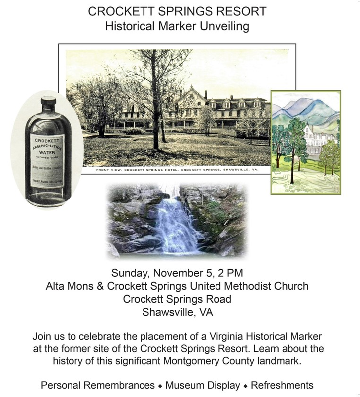 The Meadowbrook Museum presents the Crockett Springs Resort Historical Marker Unveiling on Sunday, November 5, 2023 at Crockett Spring United Methodist Church and Alta Mons along Crockett Springs Road in Shawsville, VA.