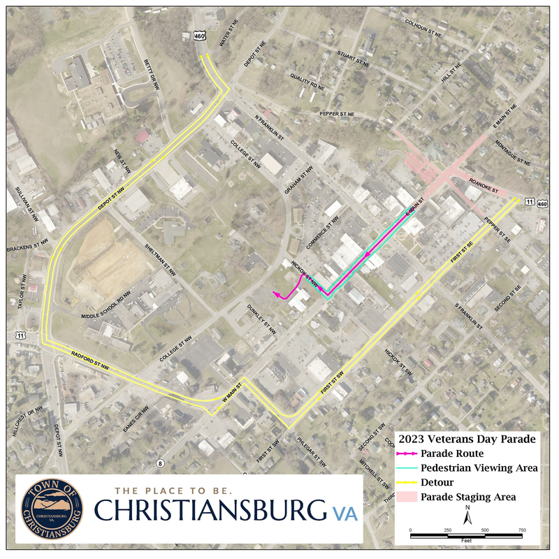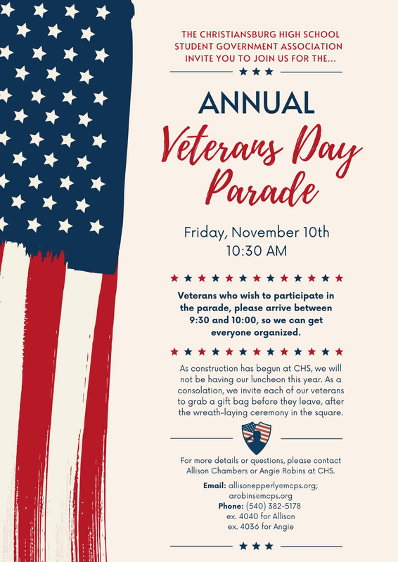 The Christiansburg High School Student Government Association presents the 2023 Veterans Day Parade on Friday, November 10, 2023 in downtown Christiansburg, VA.