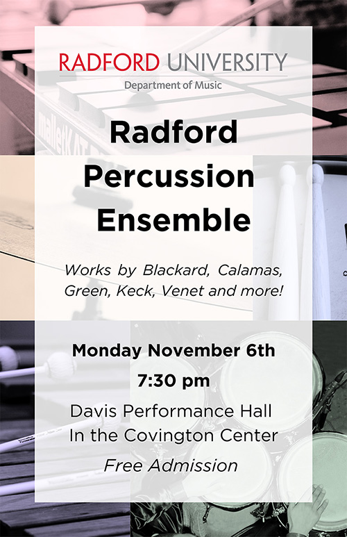 The Radford University Department of Music presents the Percussion Ensemble Fall Concert on Monday, November 6, 2023 inside Performance Hall within the Covington Center located on the campus of Radford University.