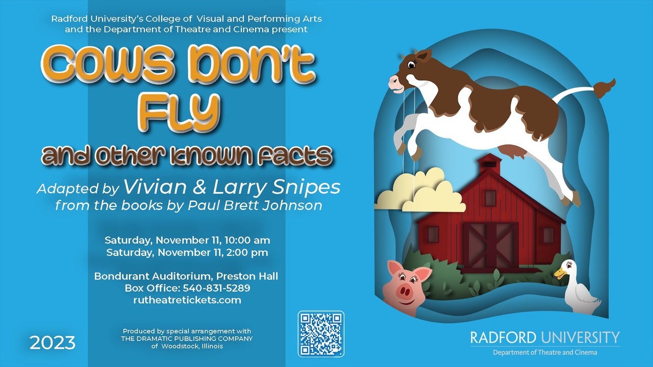 The Radford University's College of Visual & Performing Arts and the Department of Theatre and Cinema present the play "Cows Don't Fly and Other Known Facts" with two showtimes on Saturday, November 11, 2023 at 10:00 AM and 2:00 PM inside Bondurant Auditorium located within Preston Hall on the campus of Radford University.