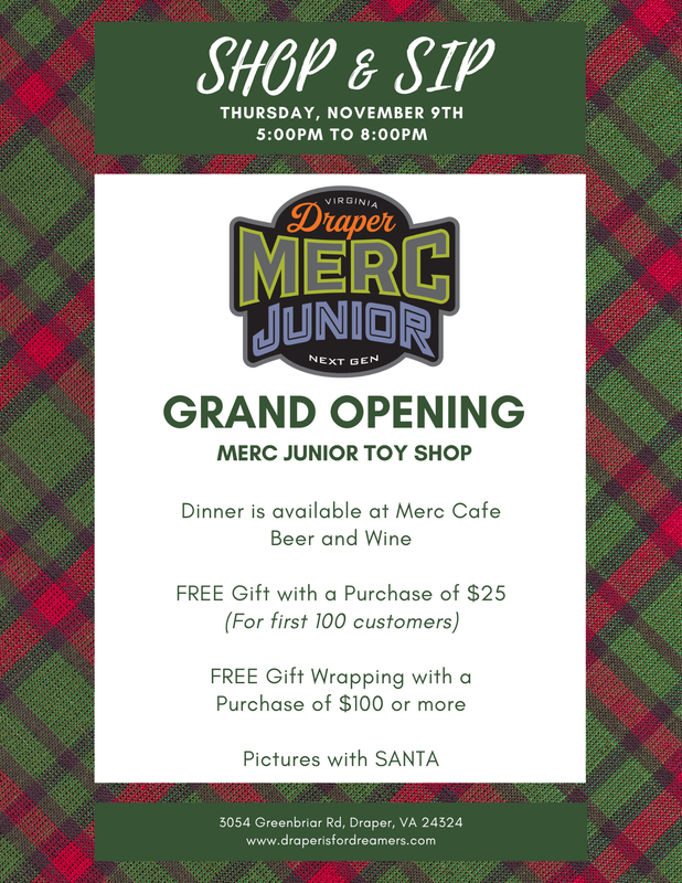 The Merc Junior Grand Opening is in collaboration with our Shop & Sip event happening at the same time. Sip on a delicious drink from the Draper Mercantile Cafe as you browse the unique and exciting gifts offered by Curious Quill.