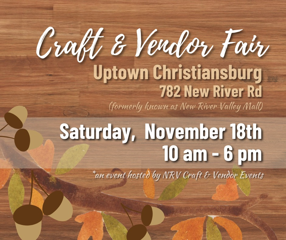NRV Craft & Vendor Events hosts their 2023 November Craft & Vendor Fair on Saturday, November 18, 2023 at Uptown Christiansburg (formerly New River Valley Mall).