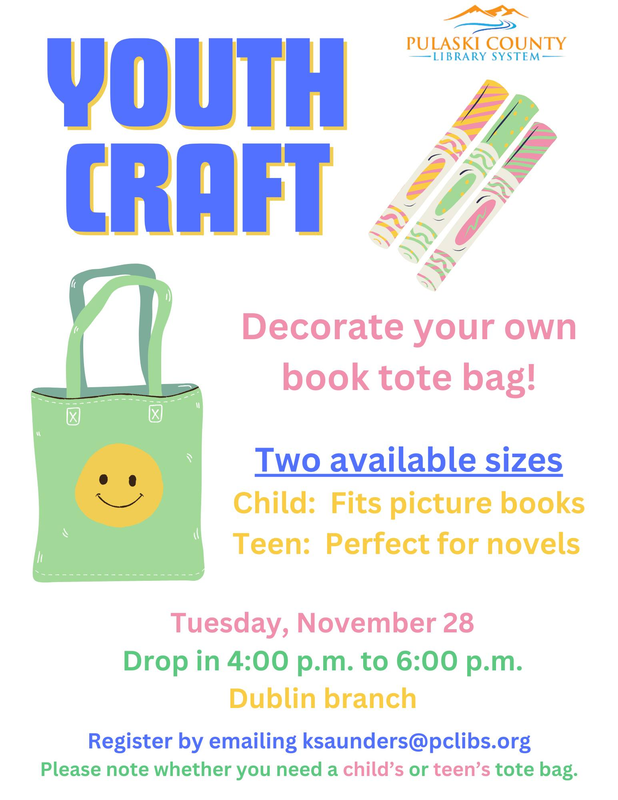 The Dublin Library (Charles & Ona B Free Memorial Library) presents the Youth Craft "Decorate Your Own Book Tote Bag" on Tuesday, November 28, 2023.