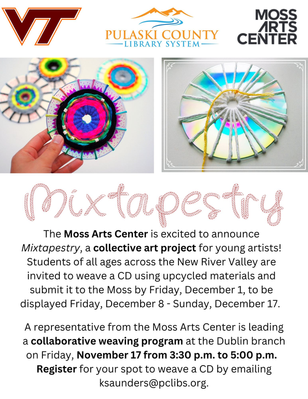The Moss Arts Center is excited to announce Mixtapestry, a collective art project for young artists! Students of all ages across the New River Valley are invited to weave a CD using upcycled materials and submit it to the Moss by Friday, December 1st, to be displayed at the Moss Arts Center from Friday, December 8 - Sunday, December 17.