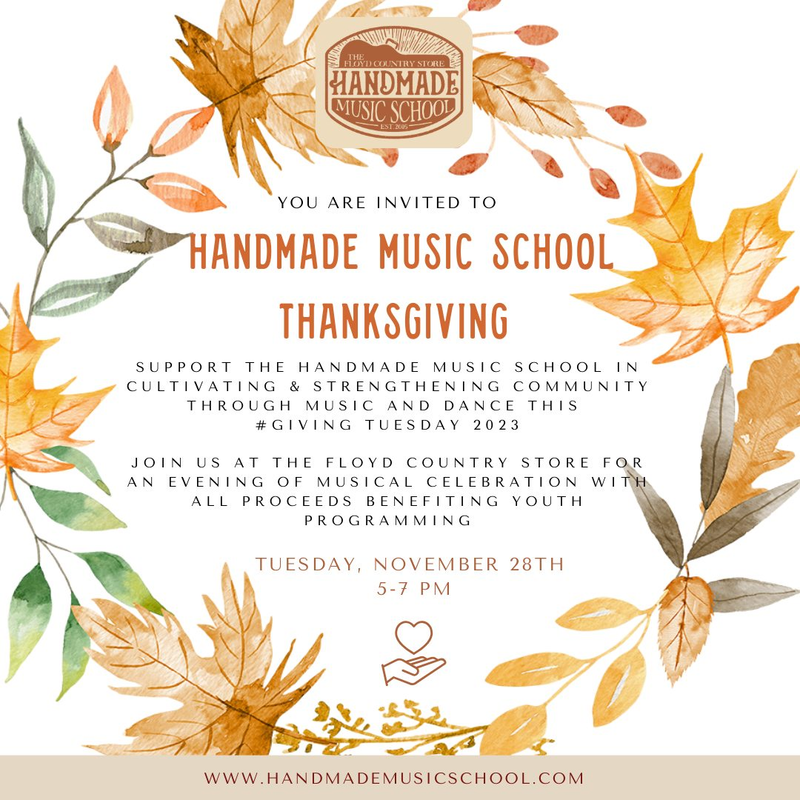 The Floyd Country Store presents Handmade Music School Thanksgiving Celebration and Fundraiser on Tuesday, November 28, 2023.