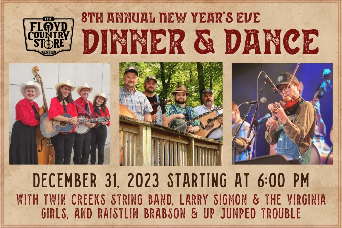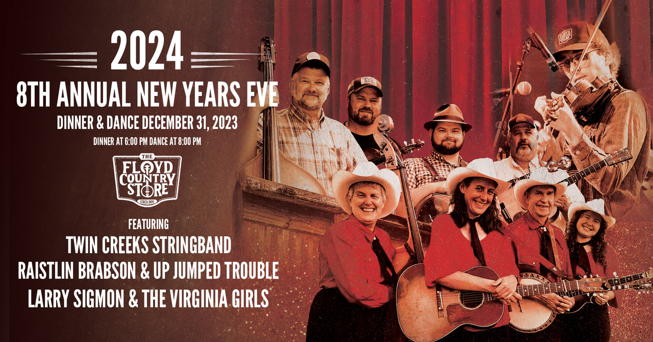 The Floyd Country Store presents their 8th Annual New Year's Dinner & Dance featuring Twin Creeks String Band, Larry Sigmon & The Virginia Girls and Raistlin Brabson & Up Jumped Trouble on Sunday, December 31, 2023.