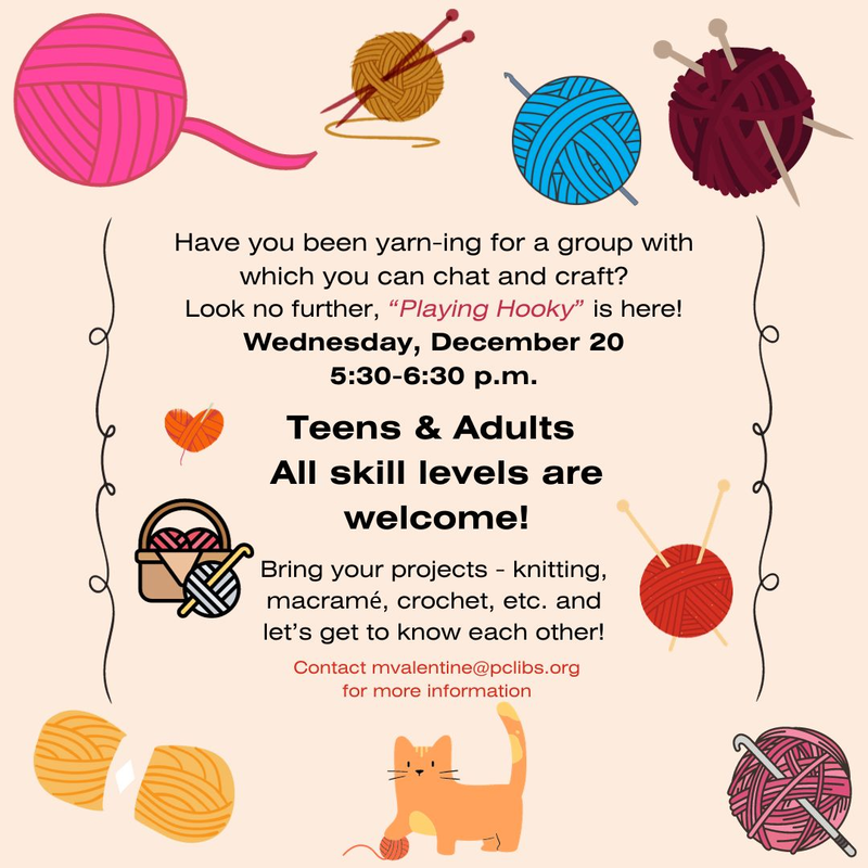 Have you been yarn-ing for a group with you can chat and craft? Join us for playing hooky our newest teen and adult group! Bring your projects and join us in the Pulaski Library community room for knitting, macrame, crochet, etc. and let's get to know each other!