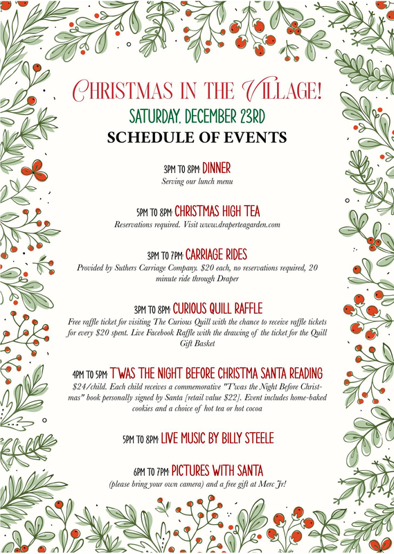 Experience the magic of Christmas with us! Enjoy carriage rides, "T'was the Night Before Christmas" Santa Reading, Pictures with Santa dinner, live music by Billy Steele from 5:00-8:00 PM, Curious Quill Raffle and more.