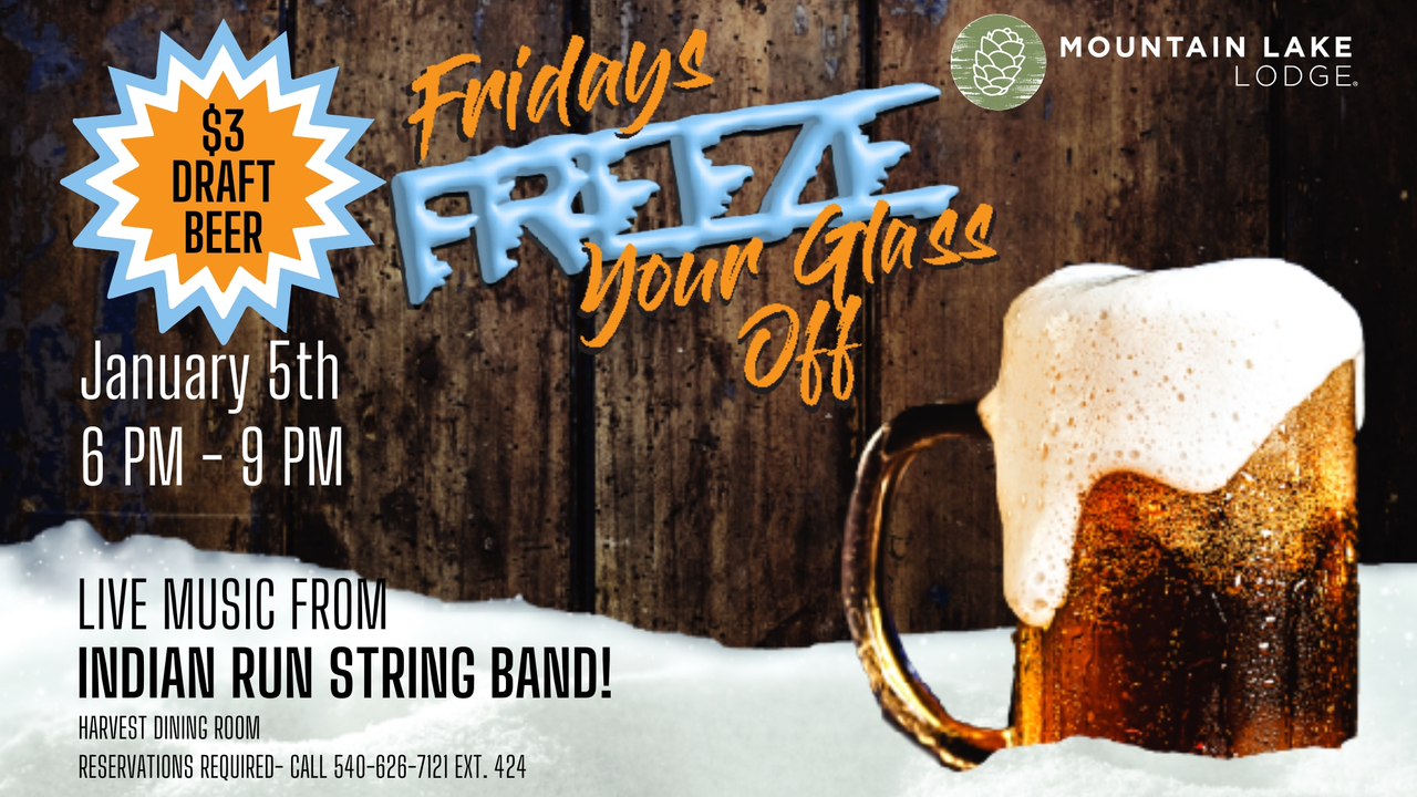 Freeze Your Glass Off Fridays are back! It's your chance to come enjoy $3.00 draft beer, a delicious Cajun buffet and live music from Indian Run Stringband!