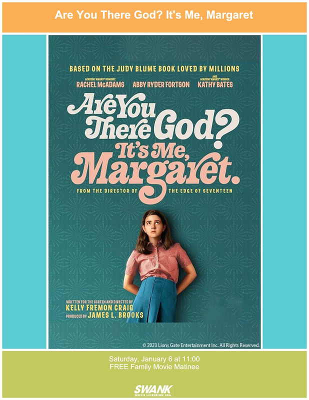 The Radford Public Library continues their Page to Screen Movies series with "Are You There God? It's Me, Margaret." on Saturday, January 6, 2024.