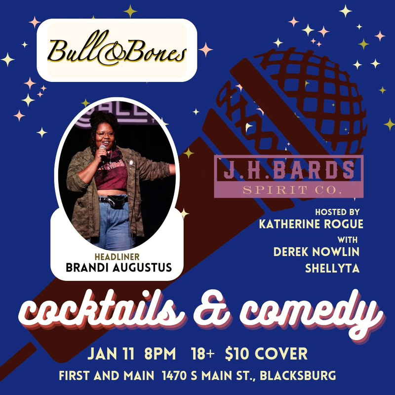 Get ready for a powerful night of comedy with the amazing Brandi Augustus. Host Katerine Rogue will be joined by local favorite Derek Nowlin and Chattanooga, Tennessee's Shellyta for her first time in Blacksburg. The show will also have a unique cocktail menu created by Robbie Hockett made with local JH Bards spirits.