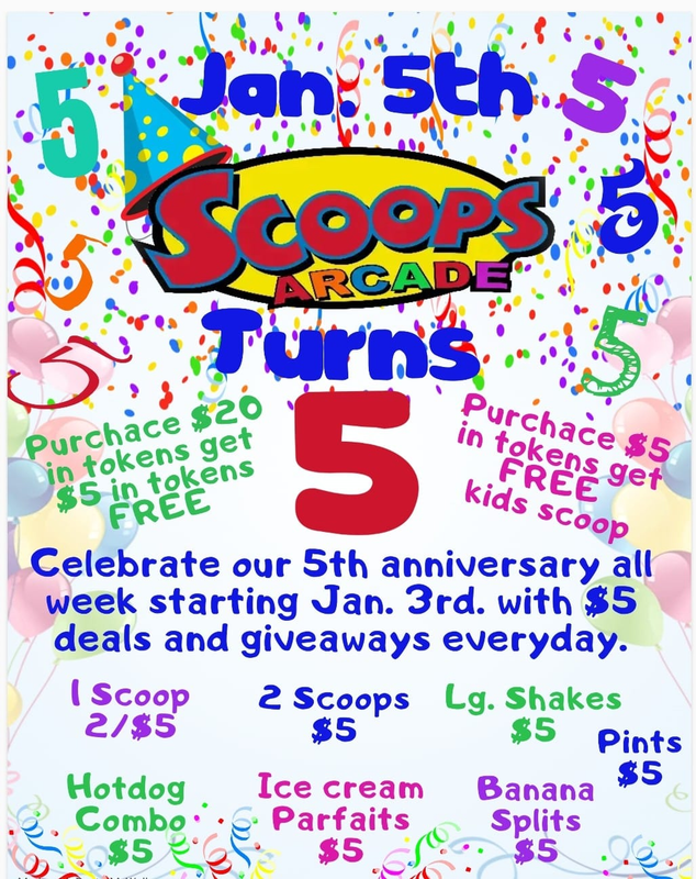 Scoops Arcade continues their Five Year Anniversary Celebration on Saturday, January 6, 2024.