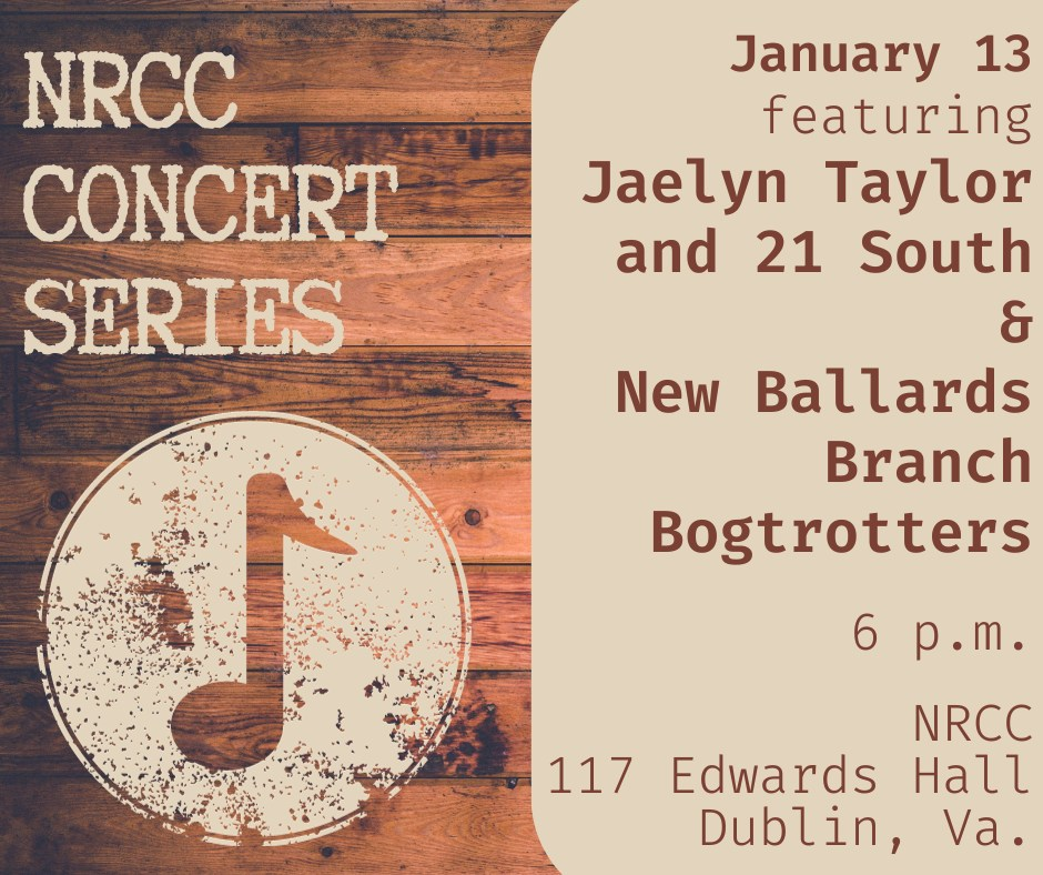 New River Community College's Concert Series presents a Free Music Concert with Jaelyn Taylor & 21 South and The New Ballards Branch Bogtrotters on Saturday, January 13, 2024 inside 117 Edwards Hall located on the New River Community College campus in Dublin, VA.