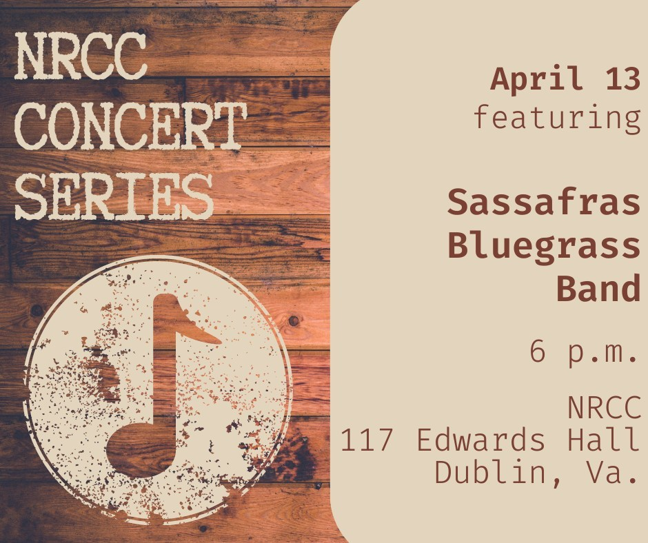 New River Community College's Concert Series presents a Free Music Concert with the Sassafras Bluegrass Band and Country Fixin' Night on Saturday, April 13, 2024 inside 117 Edwards Hall located on the New River Community College campus in Dublin, VA.
