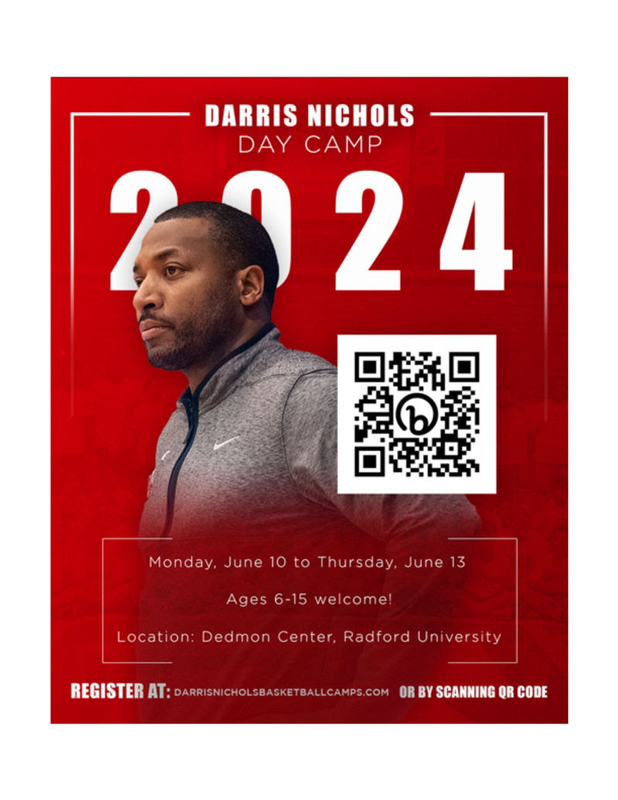 Radford University Head Men's Basketball Coach Darris Nichols hosts a Four Day Basketball Day Camp starting on Monday, June 10, 2024 and continuing through Thursday, June 13, 2024.