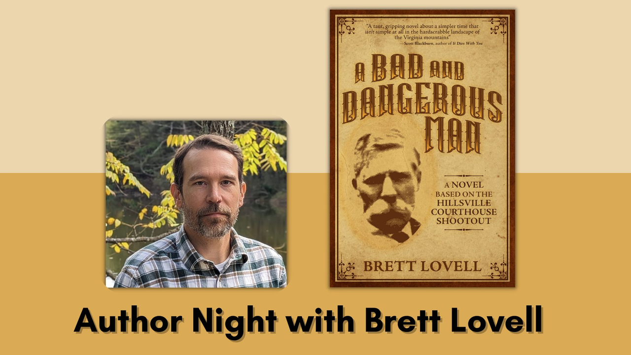 Join us for a reading and discussion with local author Brett Lovell. Brett's new novel, A Bad and Dangerous Man, is based on the true story of the Hillsville, VA courthouse shootout.
