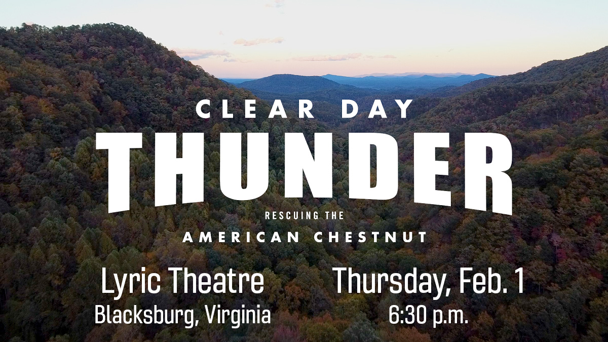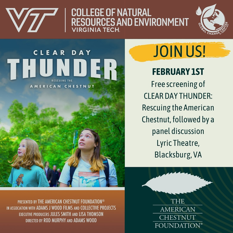 The College of Natural Resources and Environment at Virginia Tech (CNRE), the Global Change Center at Virginia Tech and The American Chestnut Foundation (TACF) presents a Screening of "Clear Day Thunder: Rescuing The American Chestnut" and a Panel Discussion following the film on Thursday, February 1, 2024 at The Lyric Theatre.