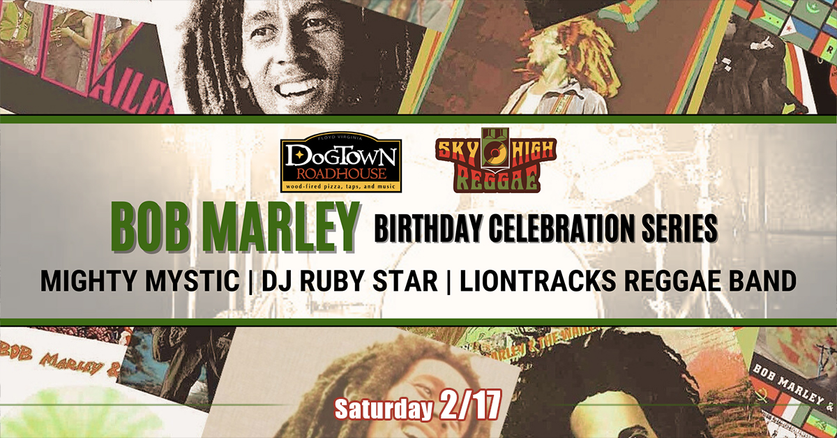Sky High Reggae and Dogtown Roadhouse presents a Bob Marley Birthday Celebration with Mighty Mystic, DJ Ruby Star and Liontracks Reggae Band on Saturday, February 17, 2024 at Dogtown Roadhouse.