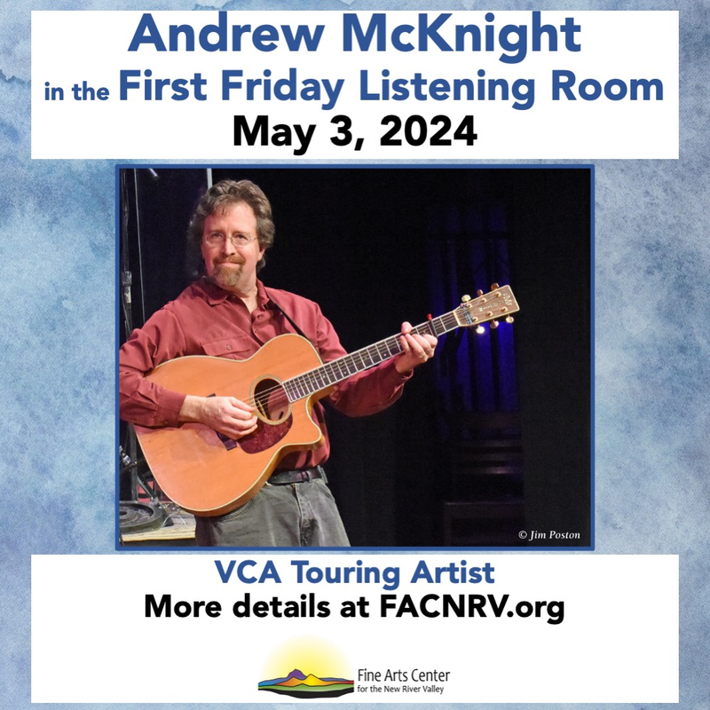 The Fine Arts Center for the New River Valley continues their 2024 First Friday Listening Room Concert Series with their May Concert featuring Andrew McKnight on Friday, May 3, 2024.