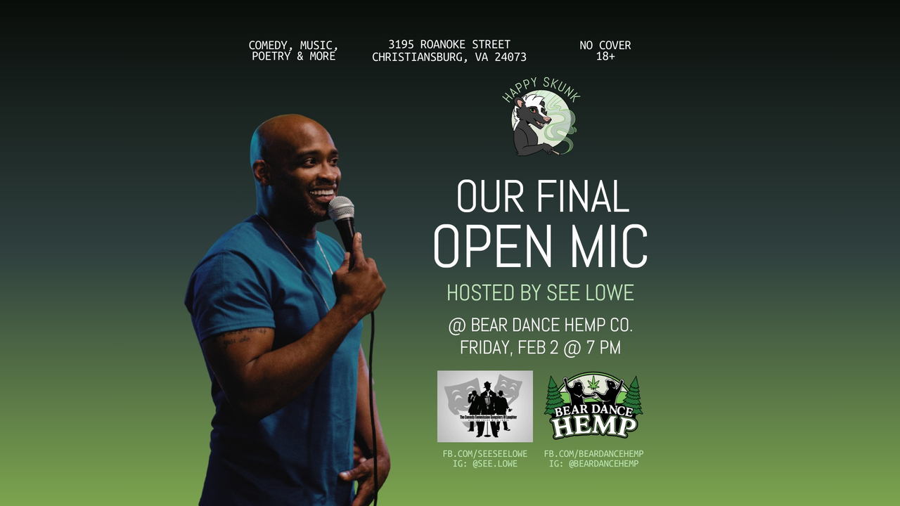 Bear Dance Hemp Company presents their Final Happy Skunk Open Mic on Friday, February 2, 2024.