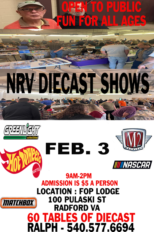 Now, Then & Forever Collectibles presents their first NRV Diecast Show of 2024 on Saturday, February 2, 2024 at the New River Valley Fraternal Order of Police Lodge.