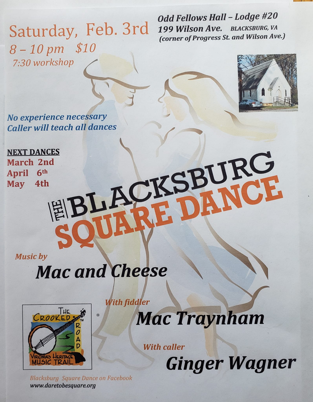 Kick up your heels at the next Blacksburg Square Dance with calling from Ginger Wanger and music by Mac and Cheese featuring fiddler Mac Traynham!