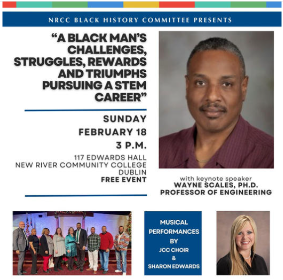 In celebration of Black History month, New River Community College and the college's Black History Committee will sponsor a guest speaker and music program. The keynote speaker will be Dr. Wayne Scales, professor of engineering at Virginia Tech, and he will present remarks on the topic of "A Black Man's Challenges, Struggles, Rewards and Triumphs Pursuing a STEM Career".