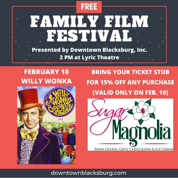 Downtown Blacksburg, Inc. continues the 2024 Free Family Film Festival featuring the film "Willy Wonka & The Chocolate Factory" on Saturday, February 10, 2024 at The Lyric Theatre.