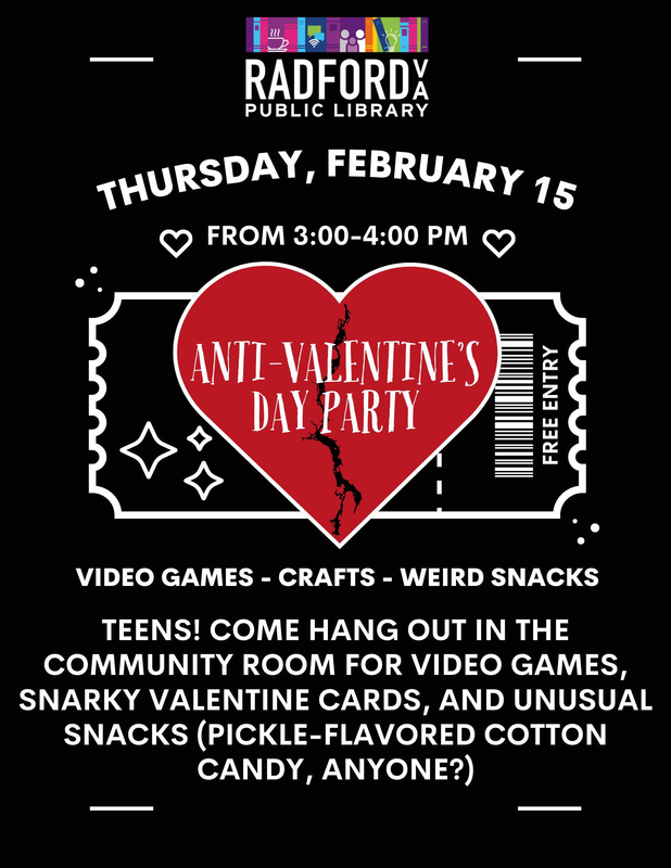 The Radford Public Library presents a Teens Anti-Valentines Day Party on Thursday, February 15, 2024.