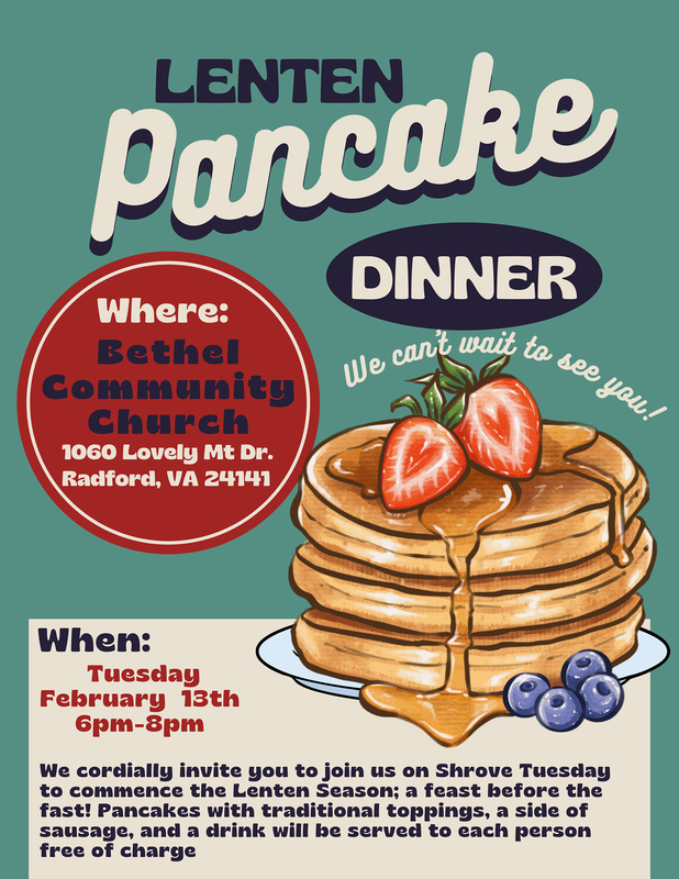 Bethel Community Church presents their Lenten Pancake Dinner on Tuesday, February 13, 2024.