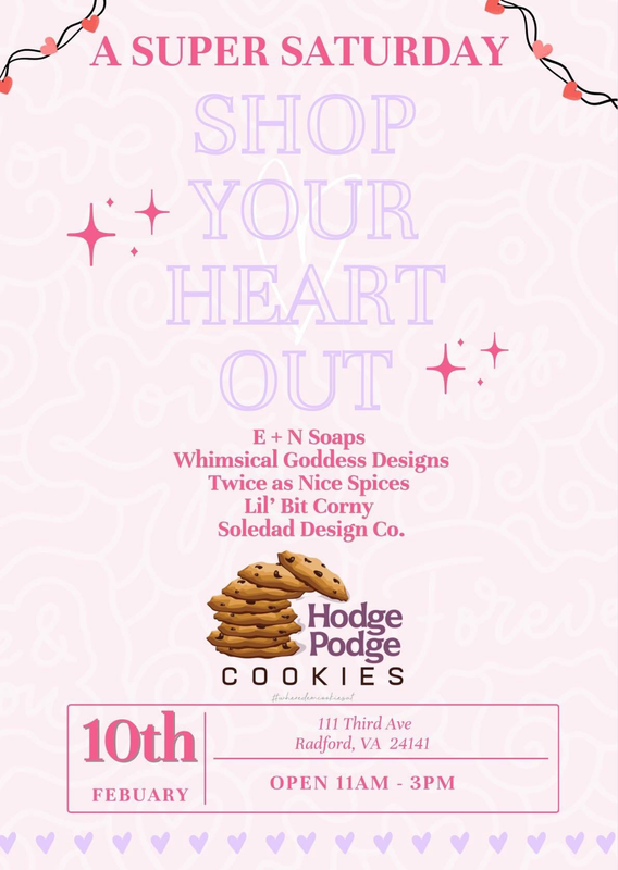 Hodge Podge Cookies presents A Super Saturday Valentine's Event on Saturday, February 10, 2024.