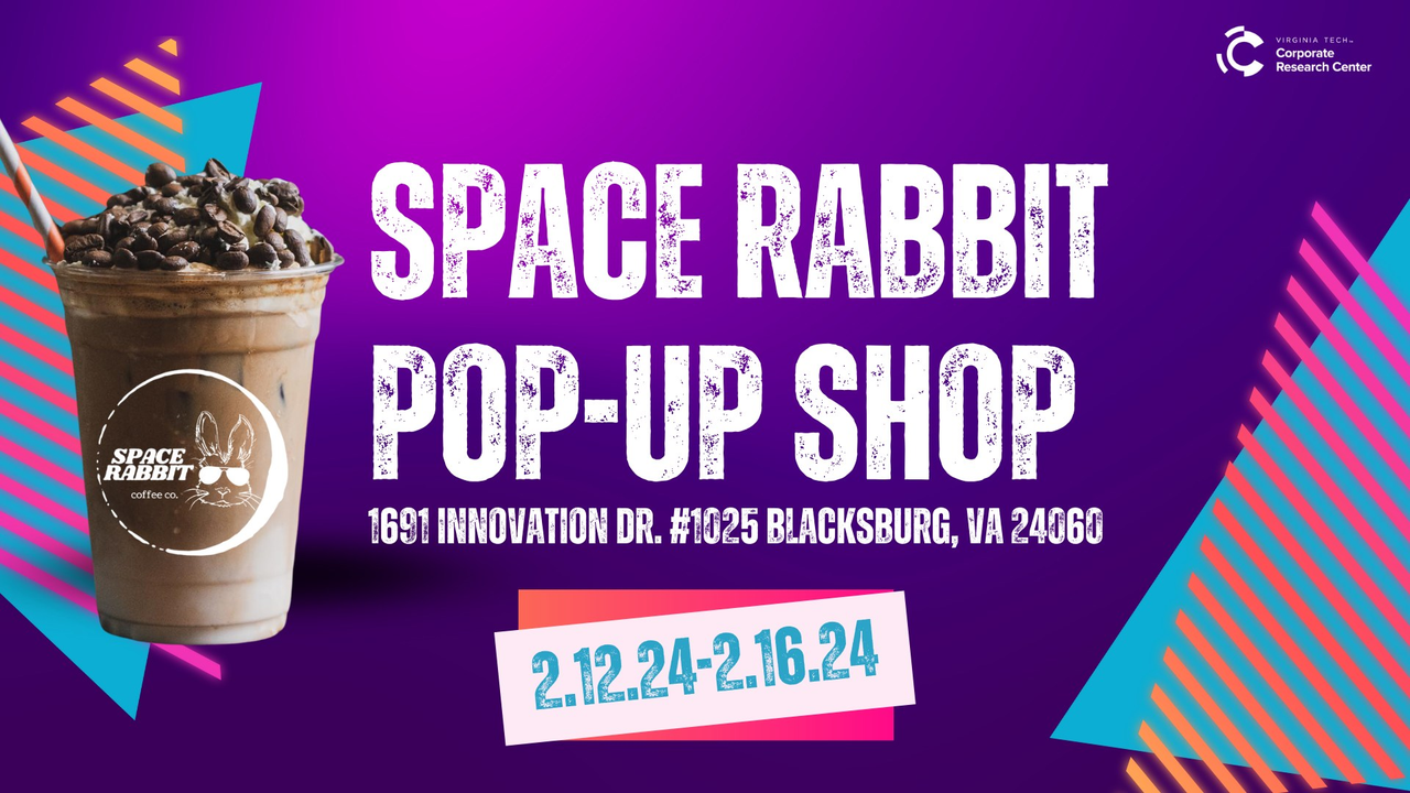 The Virginia Tech Corporate Research Center hosts the Space Rabbit Pop Up Coffee Shop occurring daily starting on Monday, February 12, 2024 through Friday, February 16, 2024 from 7:00 AM to 3:00 PM daily at the Corporate Research Center Training and Events Center.