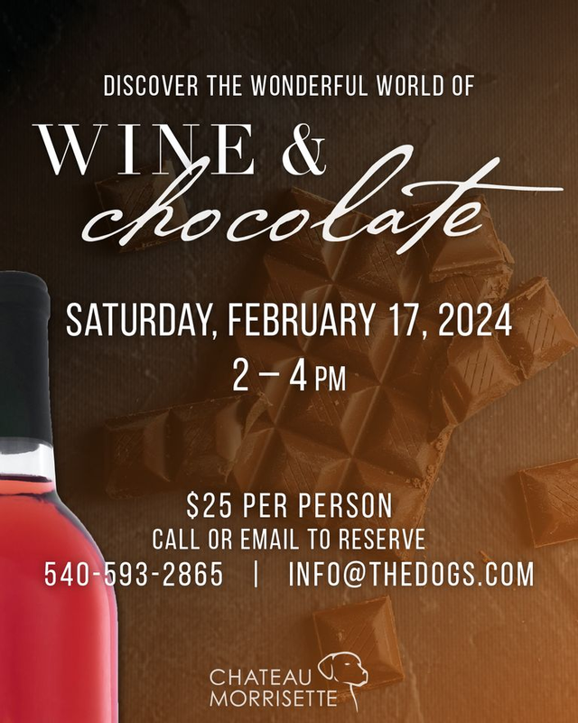 Chateau Morrisette presents a Wine and Chocolate Tasting on Saturday, February 17, 2024.