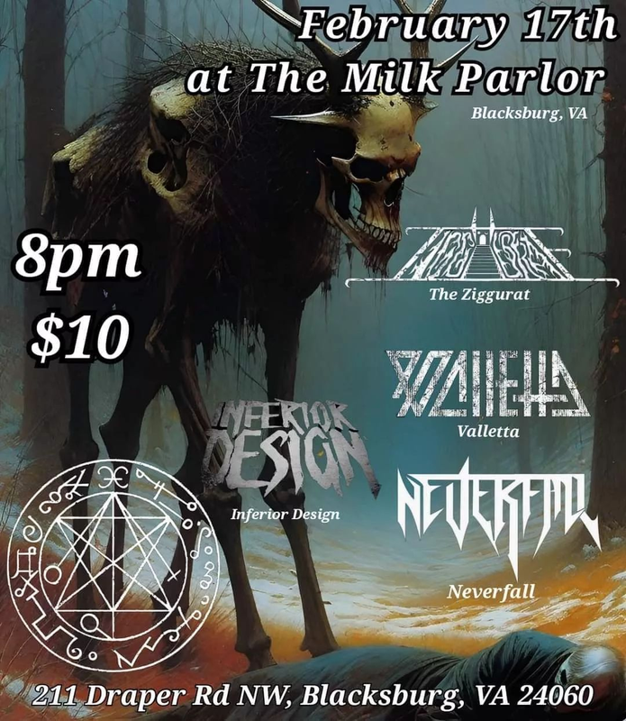 The Milk Parlor presents Metal Night with The Ziggurat, Valletta, Neverfall and Inferior Design on Saturday, February 17, 2024.