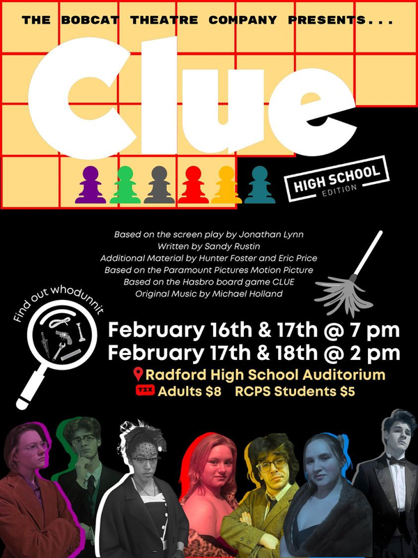 The Bobcat Theatre Company presents the play "Clue" with four performances starting on Friday, February 16, 2024 through Sunday, February 18, 2024 at the Radford High School Auditorium.