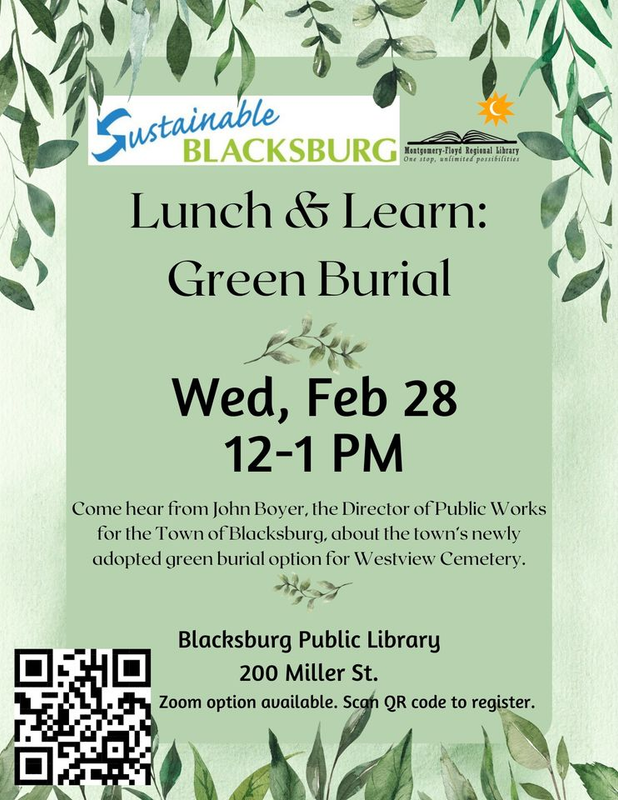 Sustainable Blacksburg continues their Lunch and Learn series titled "Green Burial in Blacksburg" offered in person at the Blacksburg Library and online on Zoom on Wednesday, February 28, 2024.