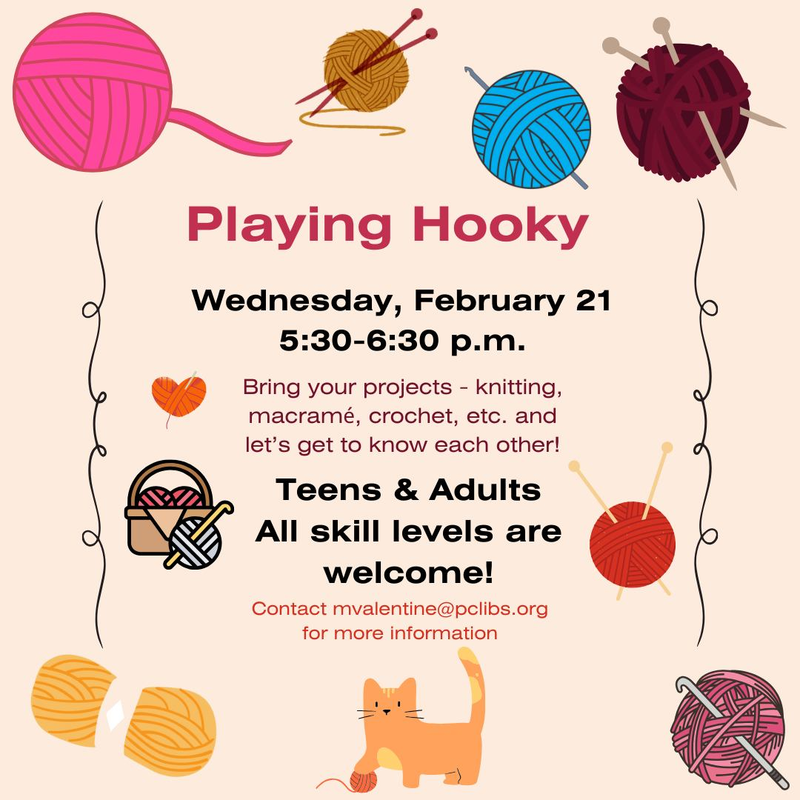 The Pulaski County Library presents the craft group "Playing Hooky" for Teens and Adults on Wednesday, February 21, 2024.