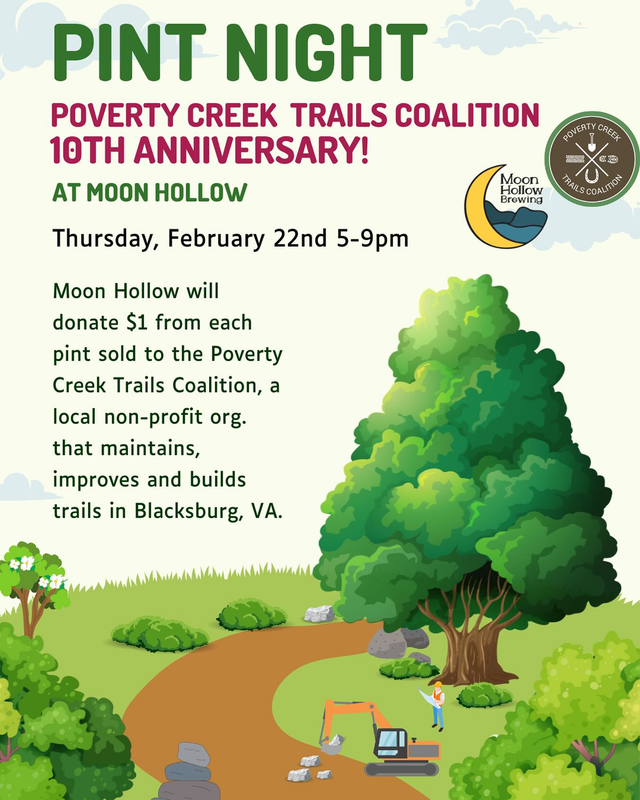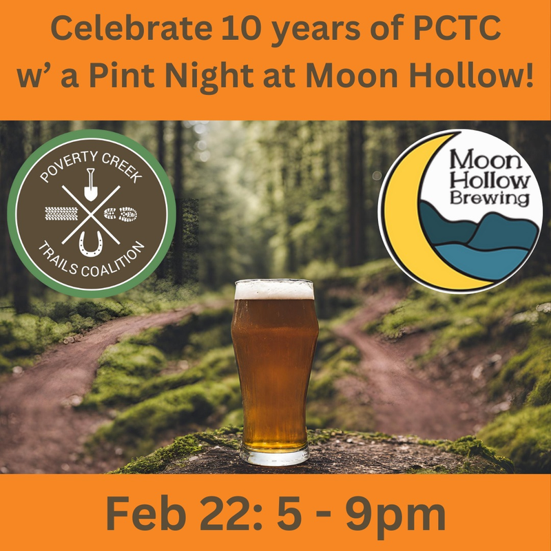 Moon Hollow Brewing presents a Pint Night and Poverty Creek Trails Coalition 10 Year Anniversary Celebration on Thursday, February 22, 2024.